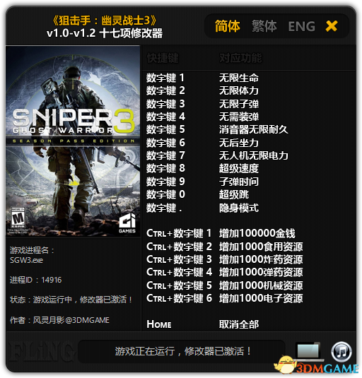 狙击手:幽灵战士3 v1.0-v1.2 十七项修改器[3DM]