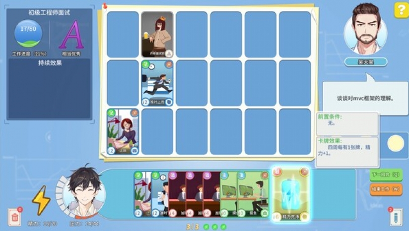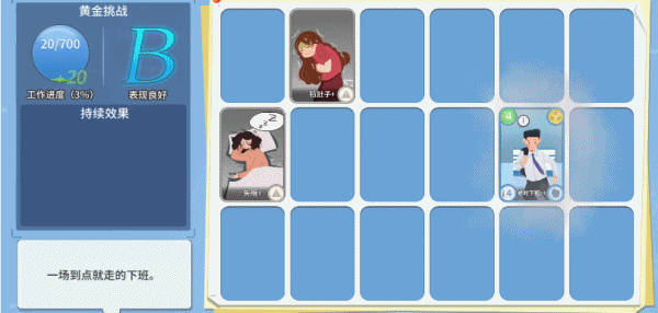 游戏融合了卡牌构筑式玩法,使用各种卡牌流派套路,解决职场中各式各样的工作挑战。