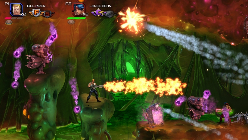 除了经典的比尔和兰斯,新角色阿丽亚娜和露西娅·德雷克已经加入。玩家可以在游戏中使用各种经典武器,通过战斗获得灵魂币,还可以在专卖店购买增强技能,比如无敌冲刺、增加血槽血量等。
