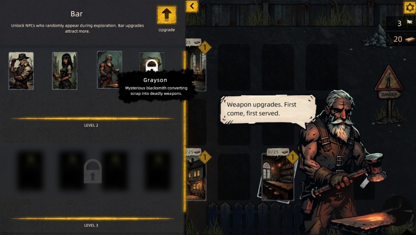 3、地牢探索结束后可以在营地解锁或升级建筑,永久提升角色能力,挑战更高难度的地图。