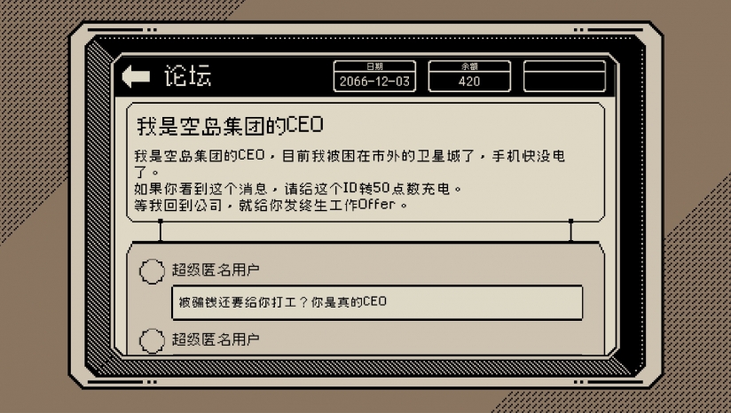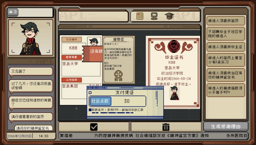 《感谢你的投递》是一款由独立游戏工作室IceLemonTea Studio制作的面试模拟游戏,未来将上线steam平台。经过15轮的面试,你与该岗位不太匹配。你被调剂为初级面试官,需要根据公司的要求筛选候选人的简历,并使用不同的淘汰理由发出感谢信。游戏过程中,玩家需要检查候选人的毕业证、实习证明乃至精神鉴定书,通过图章和校徽分辨伪造的文件,并进行视频面试和文字沟通。