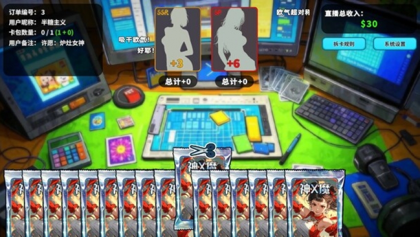 《拆卡模拟器》是一款模拟卡牌直播间主播进行拆卡赚钱的模拟经营游戏。在游戏中,你可以通过客户订单进行拆卡赚钱,也可以自己花钱体验拆卡的乐趣。