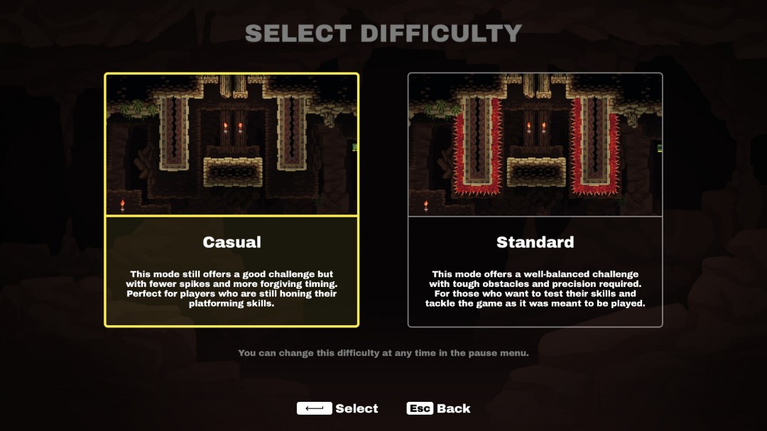 简单模式:简单模式提供更友好的游戏体验,减少尖刺挑战,并放宽判定时间。非常适合不太熟悉精准平台游戏的玩家。