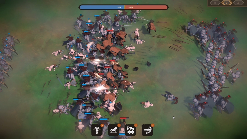 招募农民、士兵乃至皇家骑士等不同等级兵种,根据敌人特性搭配部队。战斗采用自走棋式批次进场机制,玩家需调整兵种出场顺序,并利用地形与战术影响战局。战力条实时显示敌我差距,但策略部署可实现以弱胜强。