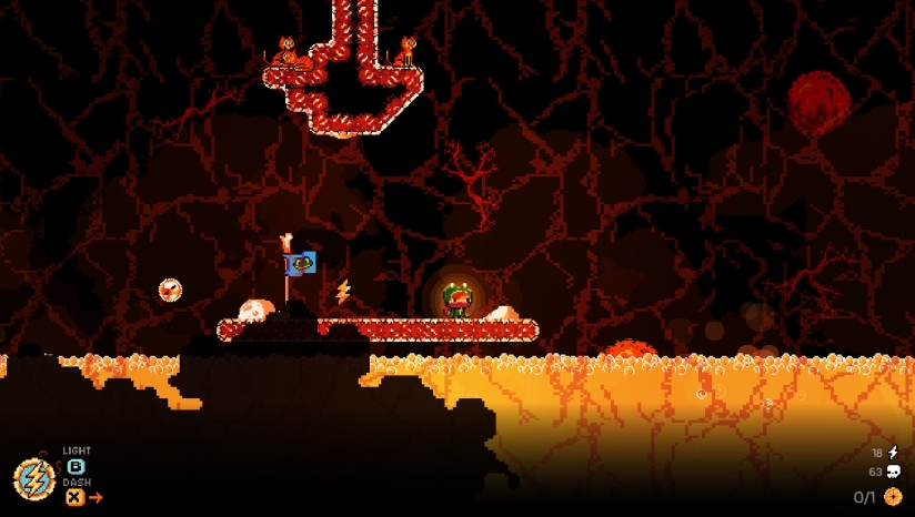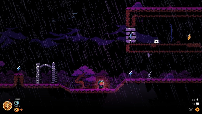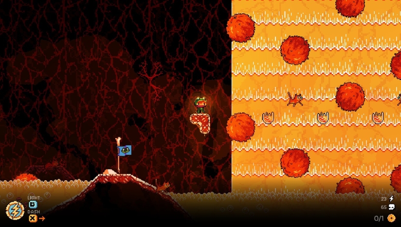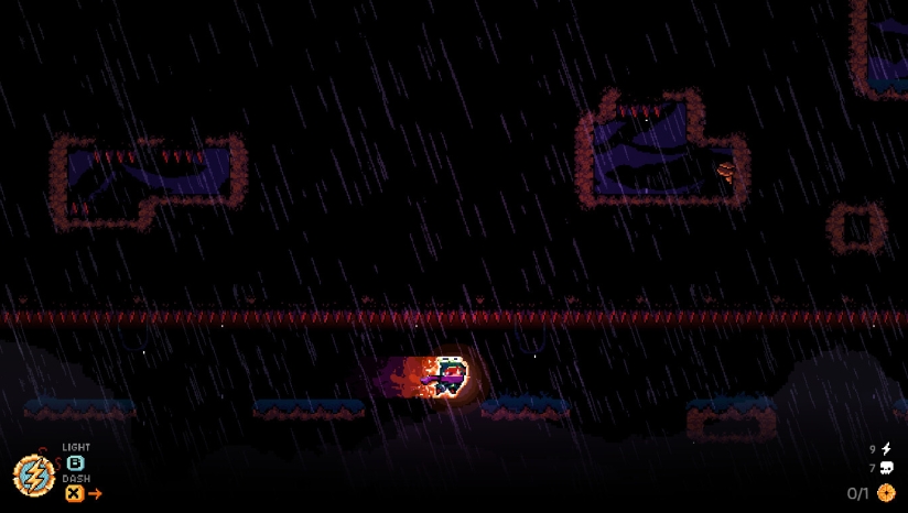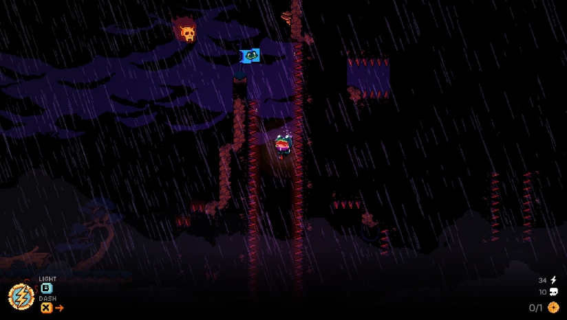 通过冲刺、二段跳穿越黑暗环境,利用闪电护身符短暂照亮场景,揭示隐藏道路与秘密。