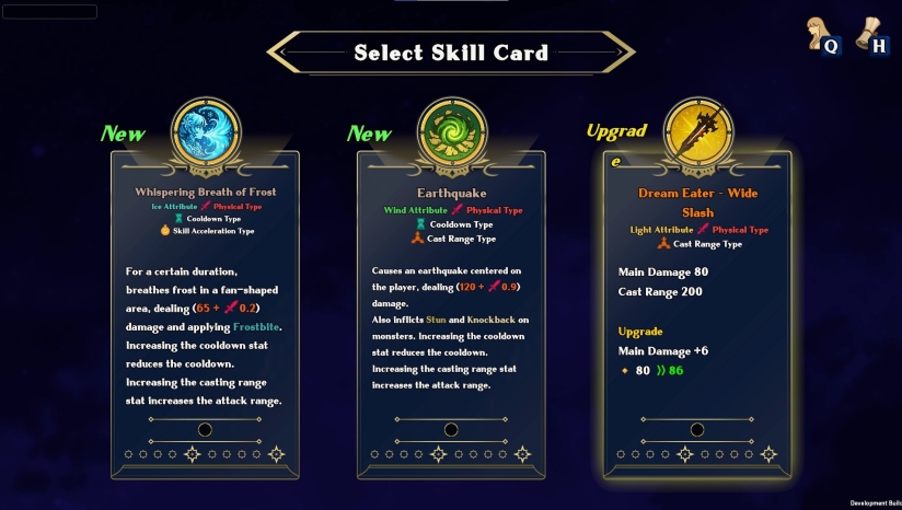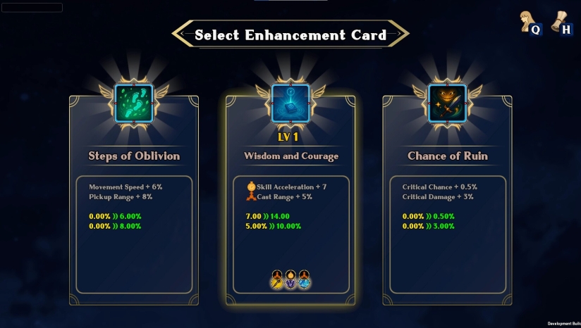 65种主动/被动技能(如旋风斩、追踪弹、护盾生成),结合23张局内强化卡牌(如“弹幕+40%范围”“攻击附加冰冻”)自由搭配流派。