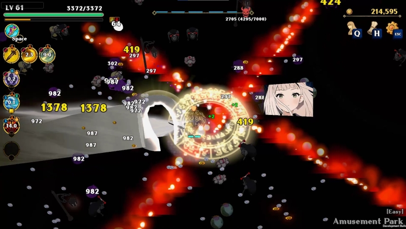 割草爽感与硬核弹幕结合,Boss战需观察弹幕规律(如螺旋弹幕、十字激光阵),搭配闪避技能实现极限操作。