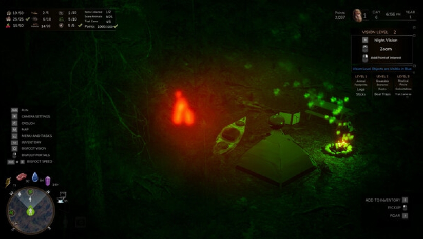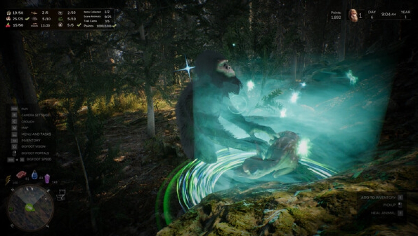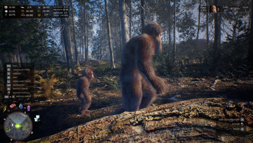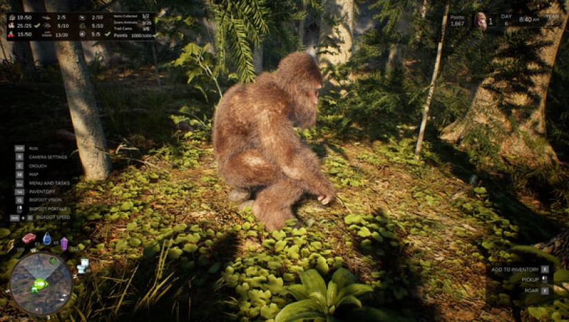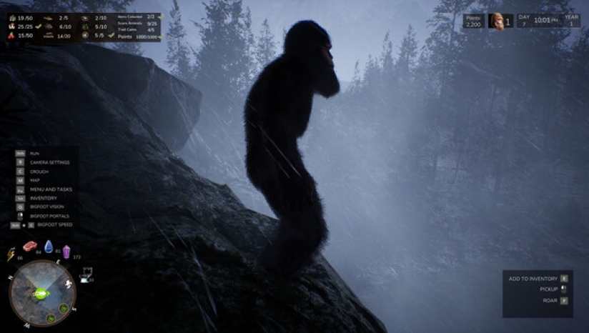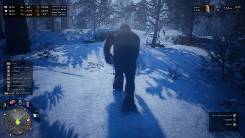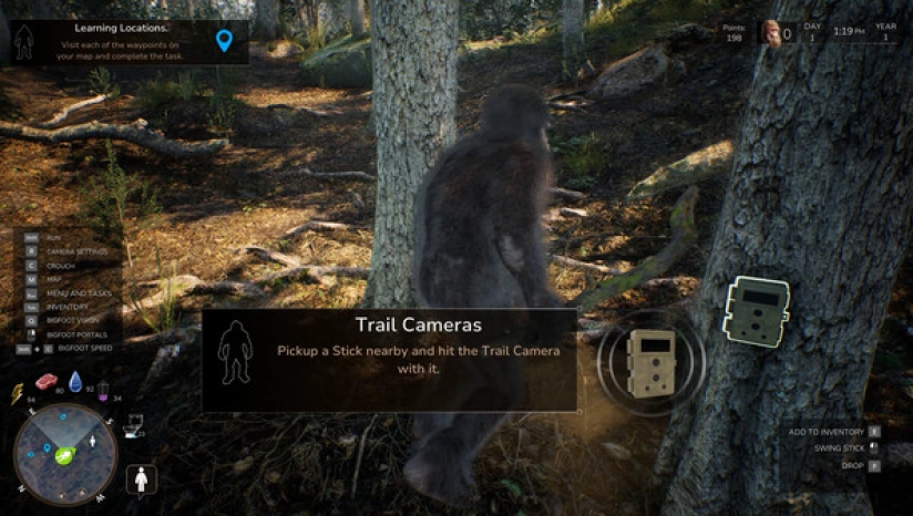 通过折断树枝、惊吓野生动物等方式获取额外积分,并逐步解锁强大的大脚怪技能,例如野兽视觉、高速奔跑、攀爬能力以及制造迷雾的特殊能力。但要小心人类猎人,他们会追踪你的踪迹,试图拍下你的照片来证明你的存在。潜入他们的营地,偷取物资,不仅可以获得积分,还能帮助你完成各种任务。