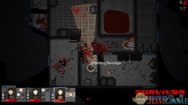 《幸存小队》采用俯视角的界面,游戏初期玩家可以控制一到两人的生存小队探索。鼠标左键为选中队员,右键点击位置让小队向指定地点移动。游戏中W、A、S、D为移动地图方向,鼠标滚轴可缩放视角。游戏中光源方向为小队人物的正前方,所以玩家要注意留意背后黑暗处。