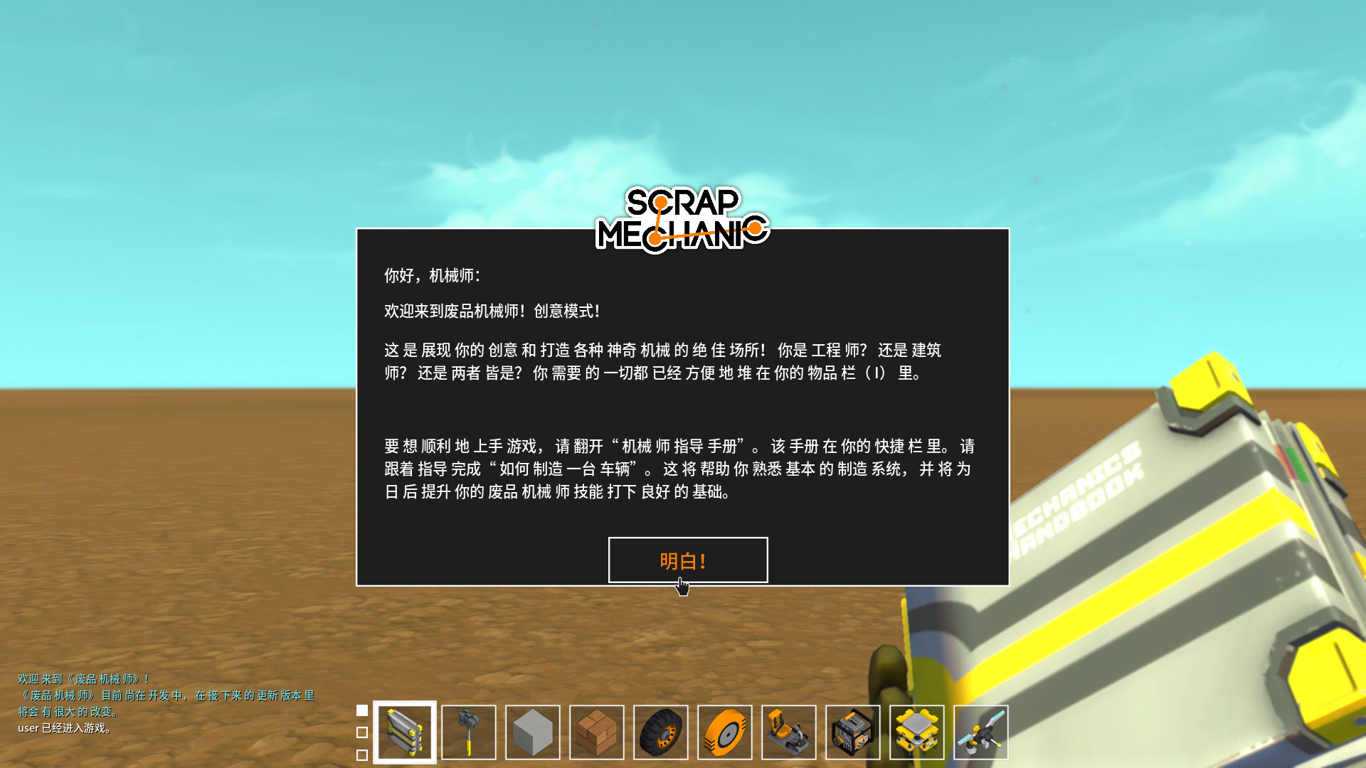 它有着沙盒游戏的高自由度:一片广袤的地图,一堆零件,就是没个整体,也不会告诉你要怎么做出你想要的东西,总之你拿着这堆莫名其妙的零件可以造出你想要的东西出来,也可能造出一个怪物。