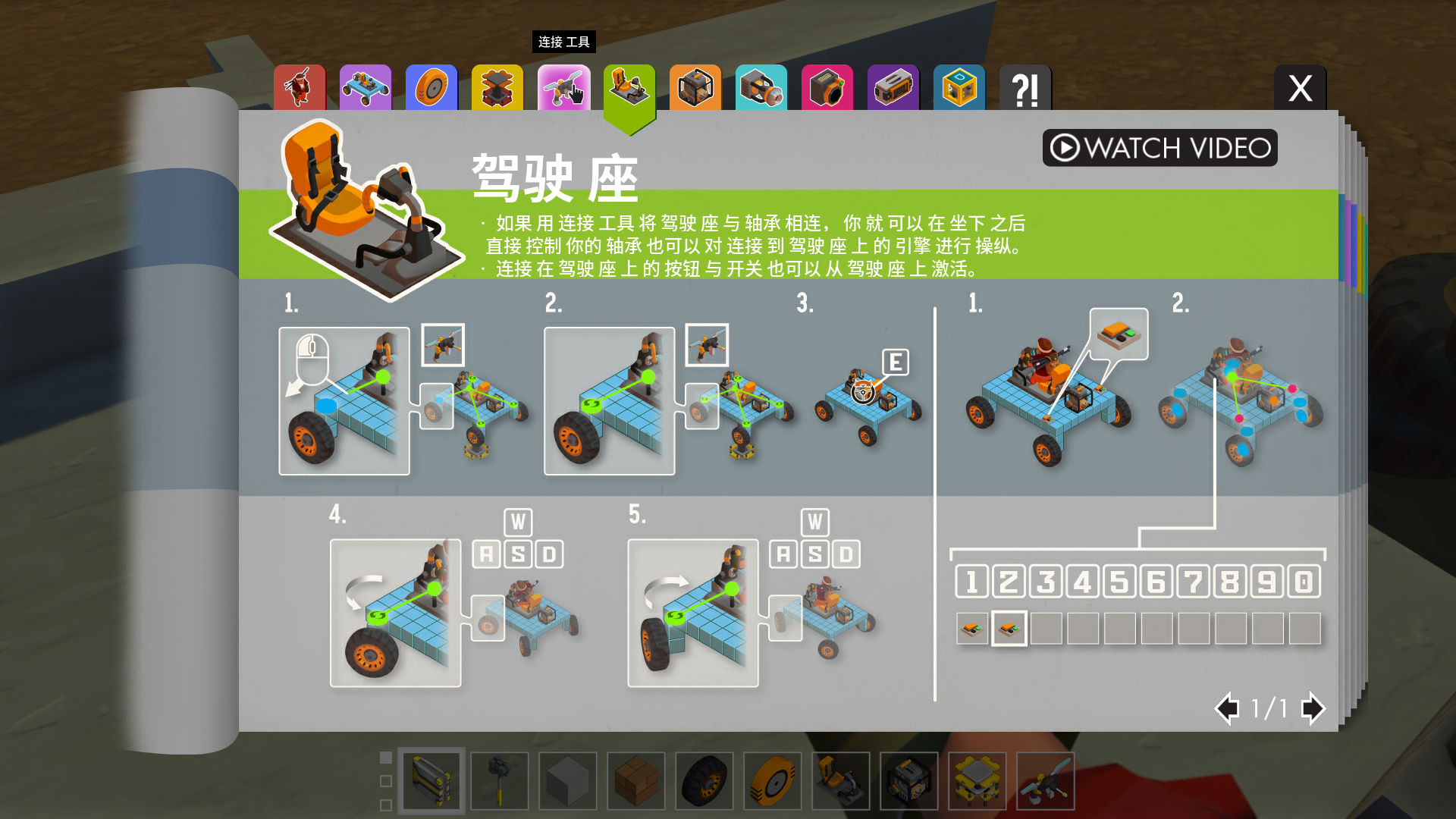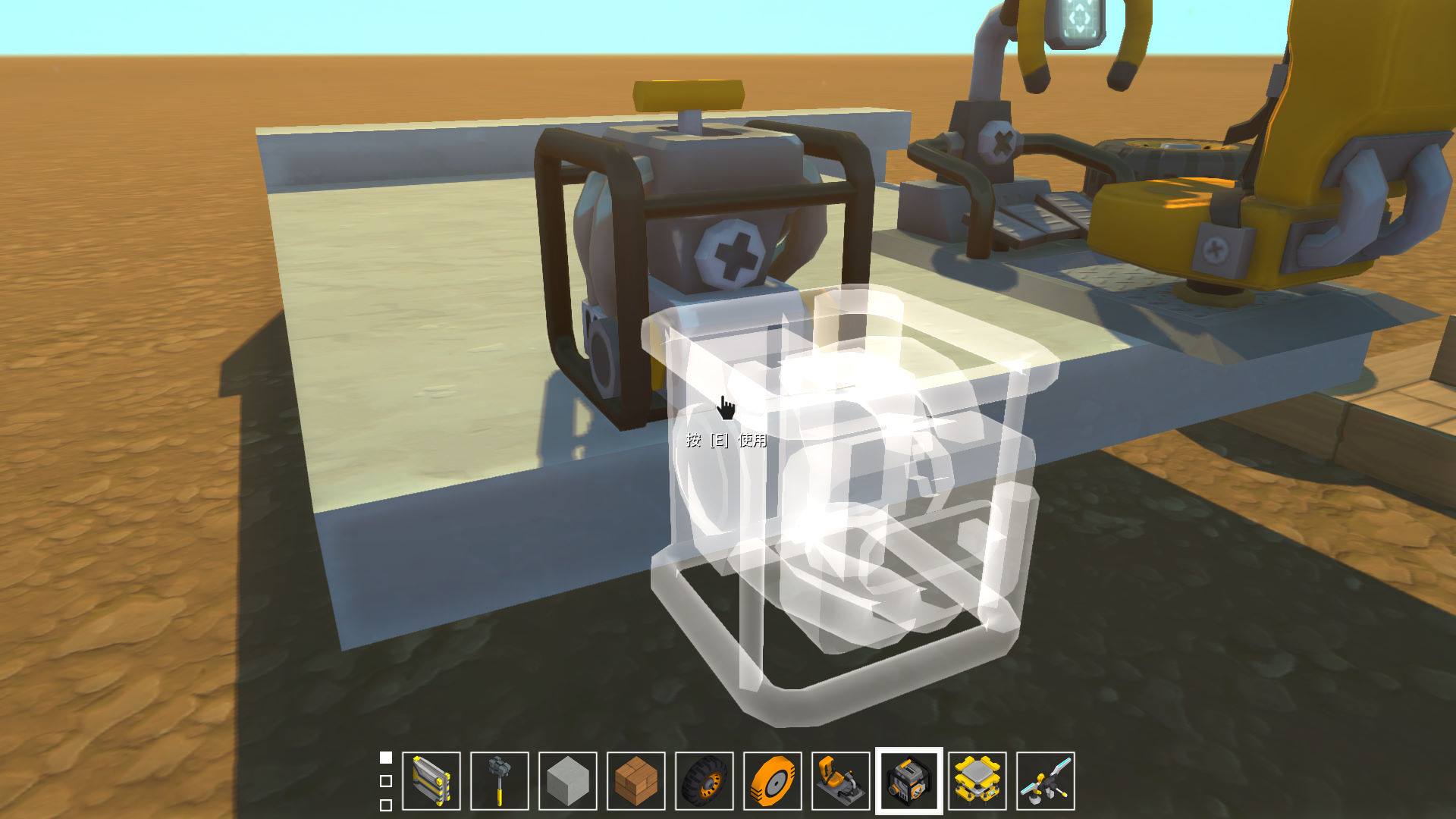 所有的可交互零件都有特殊的功能,包括移动,旋转,驾驶,飞行等,可交互零件可以做任何事情,包括汽油发动机,也可以做一个好笑的收音机,物品栏可交互零件的下方有一条橙色线条。