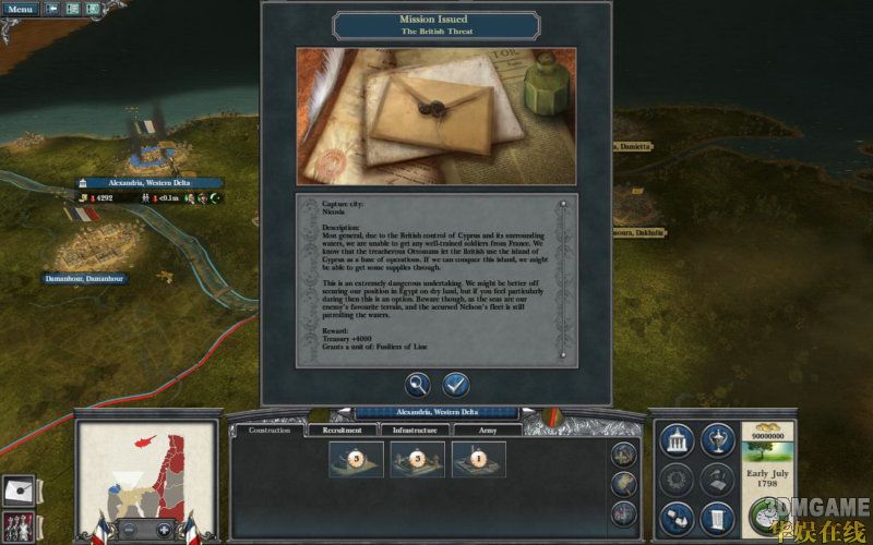 然后第二个出现的任务,可以说相当的有难度;征服塞浦路斯岛。奖励也很丰厚,你完成之后就可以造欧洲列兵;不用用中东的列兵了;不过难度很大