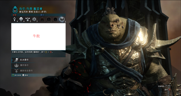 2.称号——称号这个对兽人的外观、性格、技能都会有影响,比如叫天生一对的会有两张脸、叫帅哥的如图、生蛆的满身都是洞洞;叫诗人的和你打架前会唱歌、尖叫者就一直发疯的叫、醉鬼话都说不清楚;叫无耻的很容易背叛、带蜘蛛窝的会召唤蜘蛛、食尸鬼爱好者会召唤食尸鬼,有些兽人可能会因为一些行为获得新称号,比如杀了你就会叫塔克杀手、竞技场连胜叫冠军、死而复生的叫补丁、炎魔、战争机器、幸存者等。
