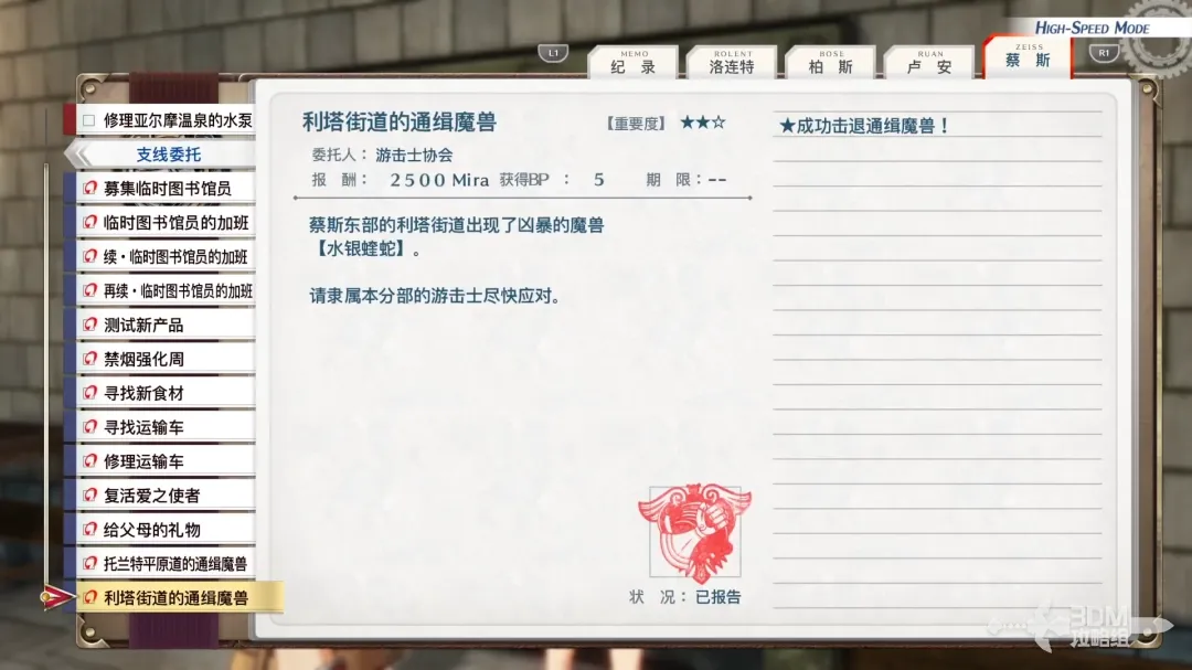 击败全部魔兽再去游击士分部报告可以获得5点bp,以及2500米拉