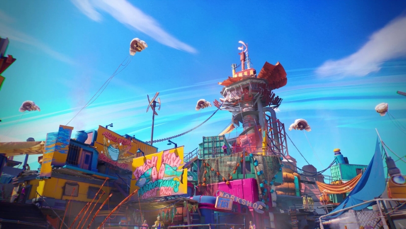 融合奇幻与写实元素,如发光海洋生物与机械悬浮平台,通过霓虹狂欢与衰败船队的视觉对比凸显末日扭曲美感。