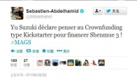 近日有消息称,日本游戏制作人铃木裕正在考虑通过Kickstarter等平台为《莎木3》募集开发资金。传出该消息的是Twitter上一名叫作Sebastien-Abdelhamid的法国记者。发布该消息的原推文截图Sebastien-Abdelhamid在Twitter上发表推文称:“铃木裕声明他正在考虑从通过Kickstarter这样的平台来为《莎木3》募集资金(Yu Suzuki déclare penser au Crownfunding type Kickstarter pour financer Shenmue 3 ! #MAGS)”。Sebastien-Abdelhamid晒出了他与铃木裕的合影但需要注意的是他的推文中并没有对铃木裕本人说过的话的直接引用,而且“正在考虑(penser au)”这几个字