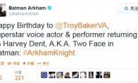 昨日(4月1日),漫画改编动作游戏系列蝙蝠侠阿卡姆的官方推特为声优特洛伊·贝克(Troy Baker)庆生,同时正式宣布他将继续在RockSteady新作《蝙蝠侠:阿卡姆骑士》中担任著名反派双面人哈维·邓特的配音演员。“祝特洛伊·贝克生日快乐,这位超级明星声优和歌手将在《蝙蝠侠:阿卡姆骑士》中作为双面人哈维·邓特回归。”与帅气文弱的外表不同,特洛伊·贝克的嗓音浑厚敦实,而《蝙蝠侠:阿卡姆起源》的小丑也让我们可喜地见识到他声音的强大多变性。贝克最近在红透半边天的《美国末日》里为男主角乔尔配音,而《乐高蝙蝠侠》里蝙蝠侠的配音演员也由他担任,因而贝克也成为唯一一位在职业生涯中同时为蝙蝠侠和小丑配过音的演员。对于蝙蝠侠阿卡姆系