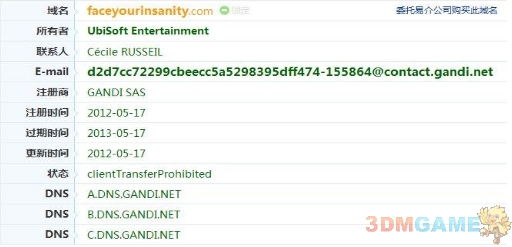 现在,育碧公司似乎已经选择了这个标题,他们在2012年5月17日注册了域名faceyourinsanity.com。根据whois信息记录显示,这个域名已经续费至2013年5月17日,目前育碧公司只注册了.com版本的域名,其他版本域名截止到发稿前尚未注册。