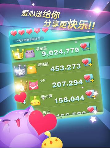 在社交网络上,《天天爱消除》也迅速成为最热门的话题之一:与“消除”有关的酷爽体验和攻略在微信朋友圈、QQ空间等随处可见,“炫耀”自己的“消除”成绩也让众多用户对这款游戏爱不释手。从用户的游戏反馈来看,社交已经成为游戏乐趣的重要因素—— “排名”、“送红心”所产生的社交乐趣已经让很多玩家放不下手机。