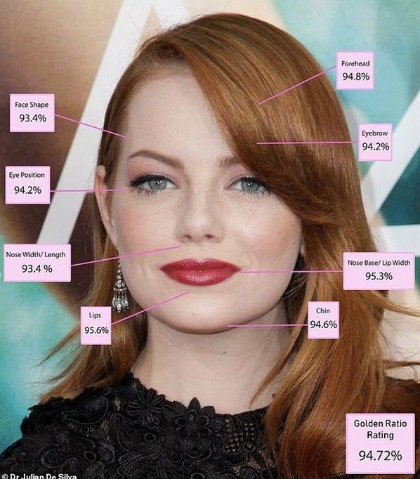 据他介绍,艾玛·斯通能够成为绝对领先者,是因为她所有面部特征都精准契合经典美学比例。