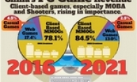市场研究公司Niko Partners给出的研究显示,到2018年时,中国手游玩家和收入将超过PC网络游戏。手游收入是增长最快的领域,到2021年时将占据总游戏收入的58%。所以在这样的大环境下,《王者荣耀》(全球火爆下载量第一、月入流水30亿元、一款皮肤日流水1.5亿)成为腾讯最赚钱的游戏也是情理之中的事情。截至2021年的未来5年,PC网游收入的年复合增长率只有1.5%,但是主要游戏构成将发生重大变化。大型多人在线角色扮演游戏(MMORPG)在PC网游中的占比将下滑,而多人在线战术竞技游戏(MOBA)和第一人称射击游戏(FPS)的占比将提升。Niko表示,电子竞技是PC网游和手游需求的一个推动力,也促使越来越多的中国玩家到网吧玩PC网游。许多国外分析师也都很认可中国游戏的市场前景,因为中国有接近6亿玩家,几