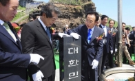 据韩联社报道,韩国庆尚北道政府19日上午在独岛(日本称竹岛)东岛望洋台举行“守护独岛标志石碑”揭牌仪式。韩国行政安全部长官孟亨奎、庆尚北道道知事金宽容等人士出席了揭牌仪式。韩国总统李明博亲自写了将刻在石碑的字句。以总统名义的碑石被设置在独岛是第一次。这块碑石用黑曜石来制作,高115厘米,横竖各30厘米。碑石前面和后面分别用韩语刻有“独岛”和“大韩民国”字样。侧面也用韩语刻有“二千十二年夏总统李明博”字句。韩国行政安全部长官孟亨奎在致词中表示,独岛标志石碑展现韩国国民对捍卫独岛的强烈意愿,这将是韩国主权的象征,发扬守护独岛的精神。庆尚北道道知事金宽容则说,期待以设置“守护独岛标志石碑”为契机,能够向全球宣布独岛属于韩国领土,并作为捍卫领土的标志,让韩国国民团结一致。庆尚北道为了纪念古代新罗異斯夫将军进入于山国(曾