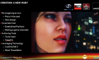 在2013GDC展会上,AMD与Crytek一同公布了次世代技术演示视频“凤凰计划”。先前AMD显卡演示中出现过的美女“Ruby”再次亮相。该演示采用了CE3引擎技术。该技术演示采用了暂命名为“AMD Graphics Core Next Architecture”的次世代架构显卡。 现场屏摄视频:早前版本的“Ruby”: