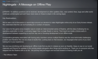 由 Infelxion Games 开发的生存游戏《夜莺传说》虽然发布后开局不错,但是因为其强制联网但同时存在大量服务器和技术性问题,它在 Steam 上的用户评价为“褒贬不一”。 一些评价提到游戏强制玩家游玩教程,然而在不断与服务器断开连接的情况下这种体验非常糟糕。特别是对于“独狼”玩家,即便一个人游玩也必须经受服务器的折磨。官方似乎已经听到了玩家呼声。InfexionGames 日前宣布,计划增加离线游戏功能。在 Steam 上发布的贴子中工作室表示:“自创立以来,我们对这款游戏的愿景就是创建一系列相互关联的世界,并考虑允许合作探索的宇宙——一个比但个世界或服务器更大的宇宙”,因此他们不得不从“从首日其就支持合作或是将重心放在离线模式上”之间做出抉择。帖子继续写道:“回顾这个决定,我们错误地判断了你们中一些