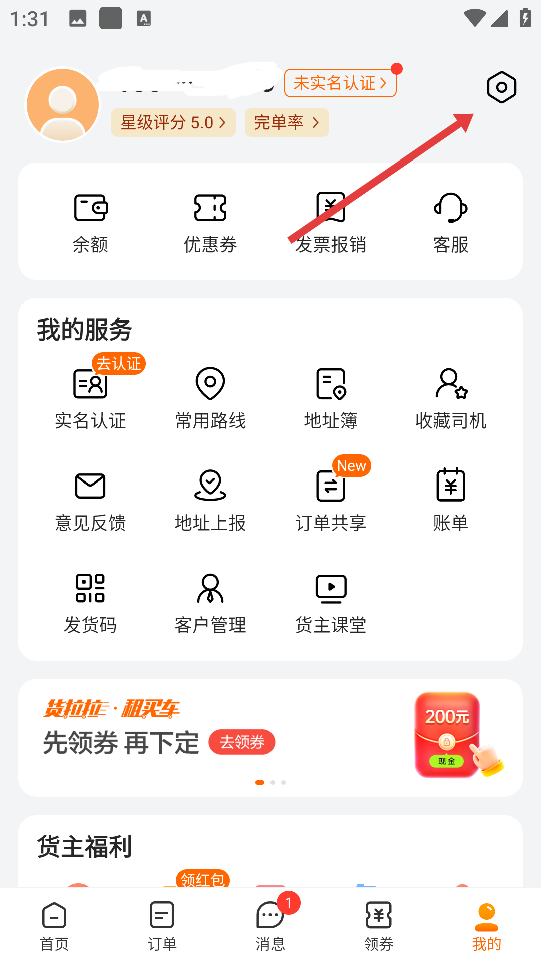 1、我的界面,用户可查看余额、优惠券等信息,还可进行实名认证、意见反馈等操作,点击设置按钮进入;
