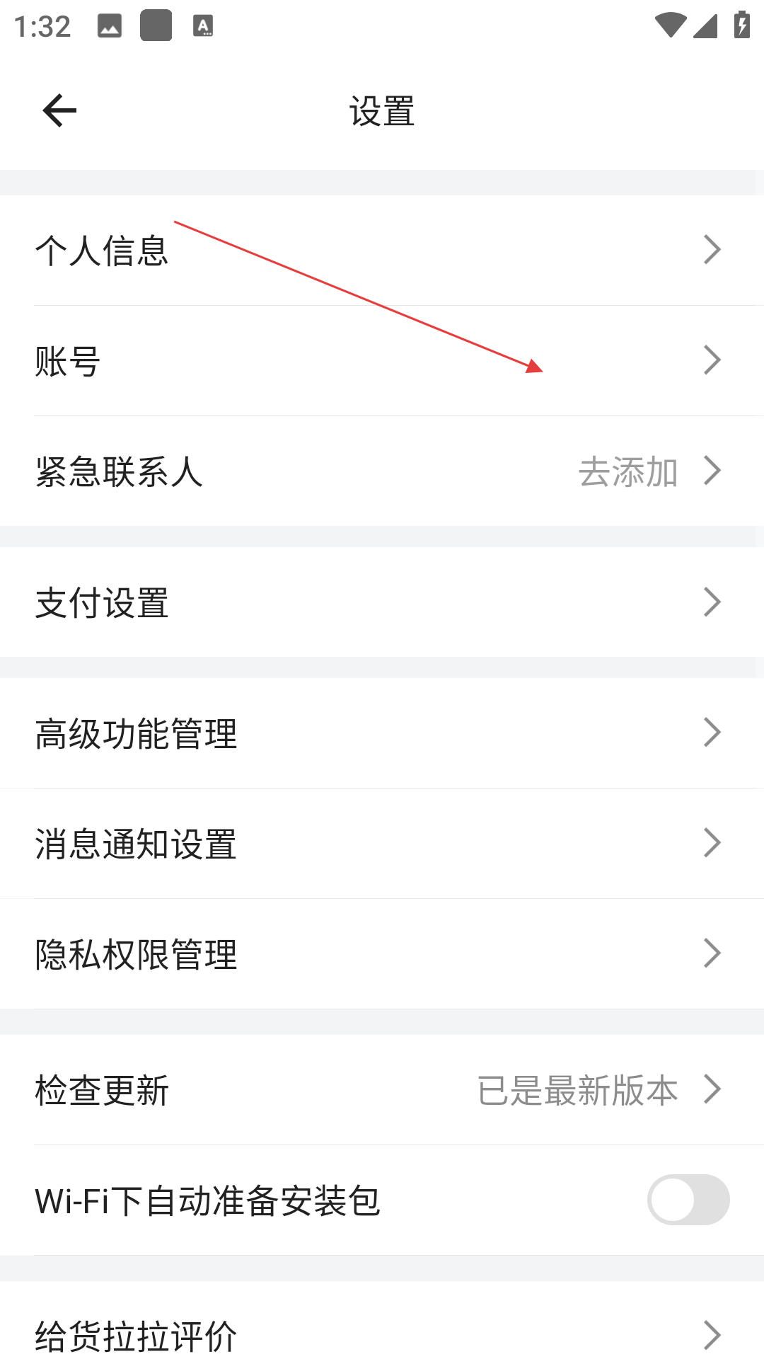 2、设置界面,用户可设置个人信息、账号、紧急联系人等,还可进行支付设置、消息通知设置等,点击账号进入;