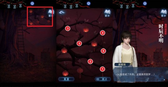 看完剧情后进入第五章,点击画面右上角的灯笼,开始灯笼谜题,需要将所有的灯笼全点亮,点的顺序可以参考下图,如果嫌麻烦可以直接跳过。