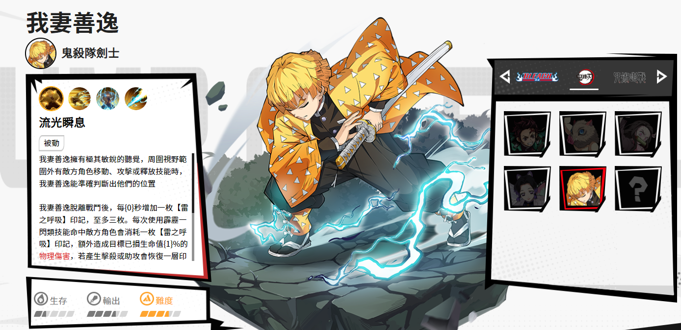 我妻善逸定位为刺客型英雄,高度还原了原作中"雷之呼吸"与"睡眠爆发"的特色设定。其技能组以雷之印为核心,兼具位移、爆发与收割能力,具体机制如下,被动技能“雷之印“。效果:普攻与技能命中可叠加雷之印,最多3层。每层印记提供8%攻击力加成,叠满后解锁终极技能"霹雳一闪"。印记叠加是输出循环的核心,需通过连招快速触发。一技能“雷之呼吸·壹之型“。基础形态向前方突进并斩击,造成物理伤害,命中叠加1层雷之印。觉醒形态潜能1级后,突进距离提升20%且附带0.5秒眩晕。连击主要起手技,可穿越薄墙体。二技能“四连斩“。效果对范围内敌人进行4次快速斩击,每次命中叠加1层雷之印,总伤害系数达320%攻击力。配合突进技能可瞬间打满印记,是爆发连招的关键。终极技能“霹雳一闪“。触发条件为雷之印叠满3层后解锁。效果为瞬间闪现至目标身旁造成450%攻击力的物理伤害,击杀目标重置冷却。潜能加成激活潜能二可提升伤害至500%攻击力。技能连招推荐:基础连招一技能(突进)→二技能(叠印)→普攻(补印)→终极技能(收割)爆发连招:二技能(起手)接一技能(调整站位)→终极技能→二技能(补伤害)逃生连招:一技能(位移)→终极技能(锁定残血目标位移)