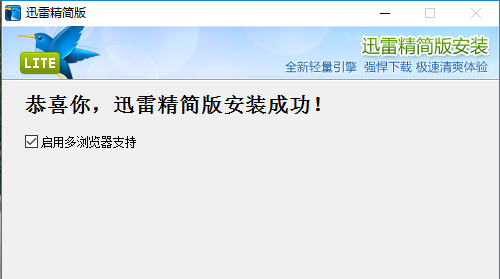 3、安装结束后,会自动跳转至安装成功界面。如果勾选上“启用多浏览器支持”选项的话,会在浏览网页点击右键时,出现一个额外的“使用迅雷精简版下载”选项,下载更方便。选择完成后点击“关闭”按钮即可。
