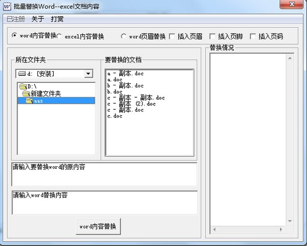 1、word文档中列入要替换“”成都保险公司“”替换成“四川人保”,只需输入相应的关键字就可以替换,100个-1000个以上文档都可以替换,替换越多时间会稍长一点,