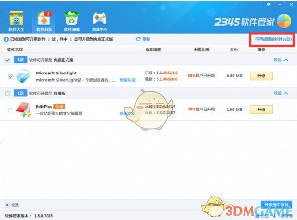 可以打开【软件升级】栏右上角的”不再提醒的软件“,如果您曾经屏蔽该软件的升级信息,即可在这里找到,恢复提示即可升级。