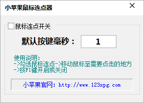 小苹果鼠标连点器是一款非常实用的鼠标连点工具,软件界面简洁,操作简单易用,支持一键进行鼠标连点,帮助用户对游戏,网页等进行连点操作,可以抢红包,网页连点操作类,连续点击很方便,省去了你去点击鼠标的工作,抢红包速度超级快,感兴趣的小伙伴赶快来下载使用吧!