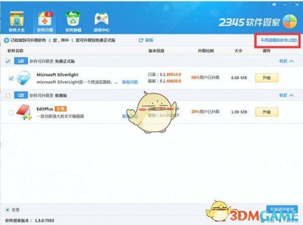可以打开【软件升级】栏右上角的”不再提醒的软件“,如果您曾经屏蔽该软件的升级信息,即可在这里找到,恢复提示即可升级。